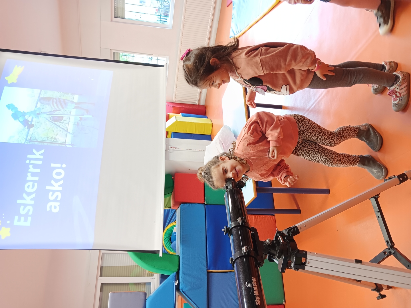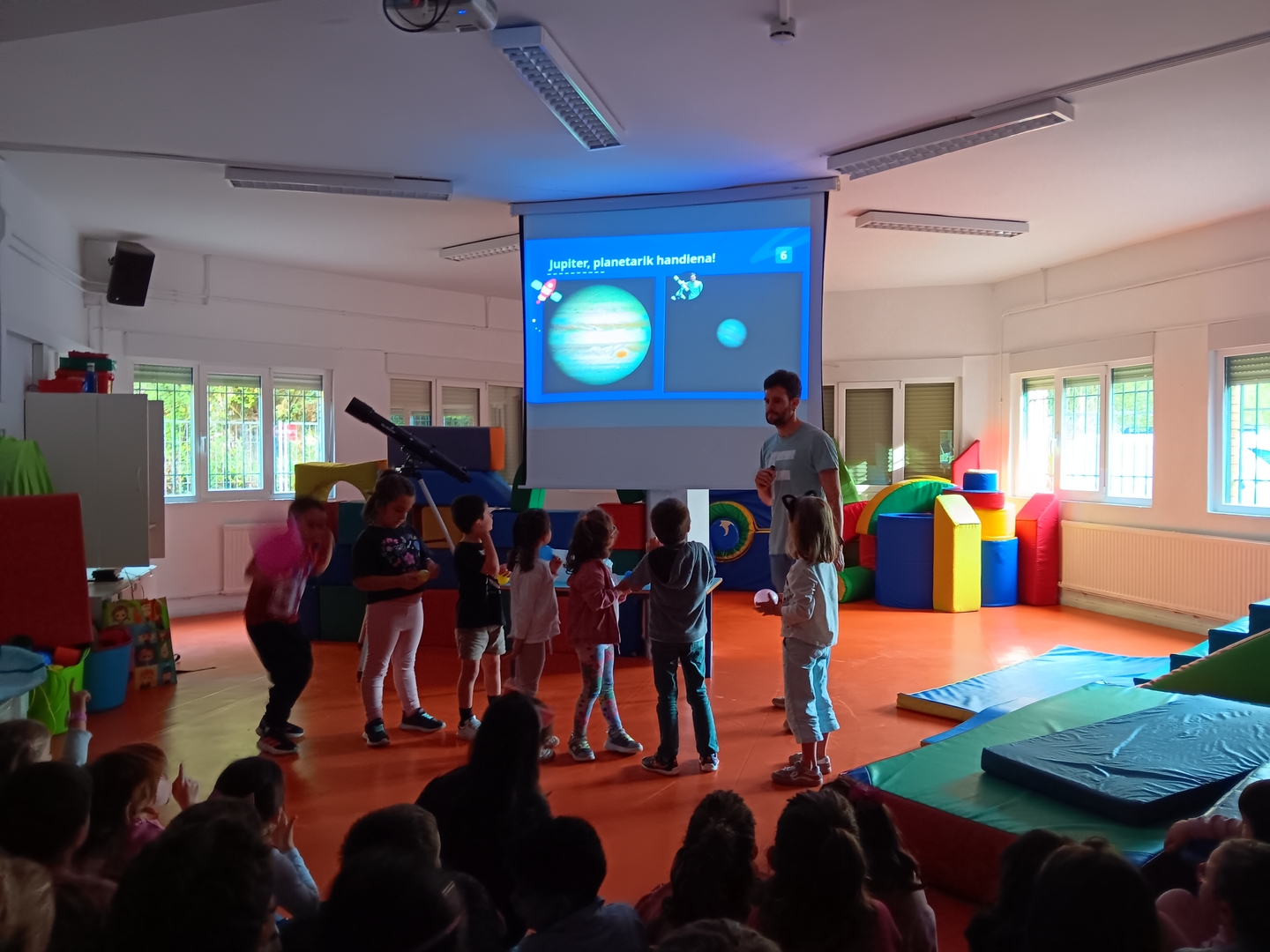 Egun berdinean Haur Hezkuntzako 5 urtekoengana ere hurbildu zen Urtzi, "Teleskopioa, planetak, izarrak⦠gauza asko ikasi ditugu eta oso gustura egon gara. Mila mila esker!".