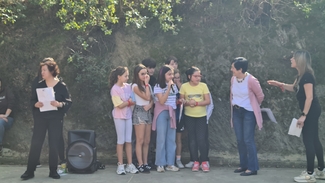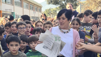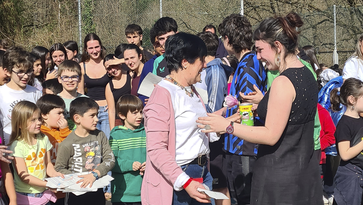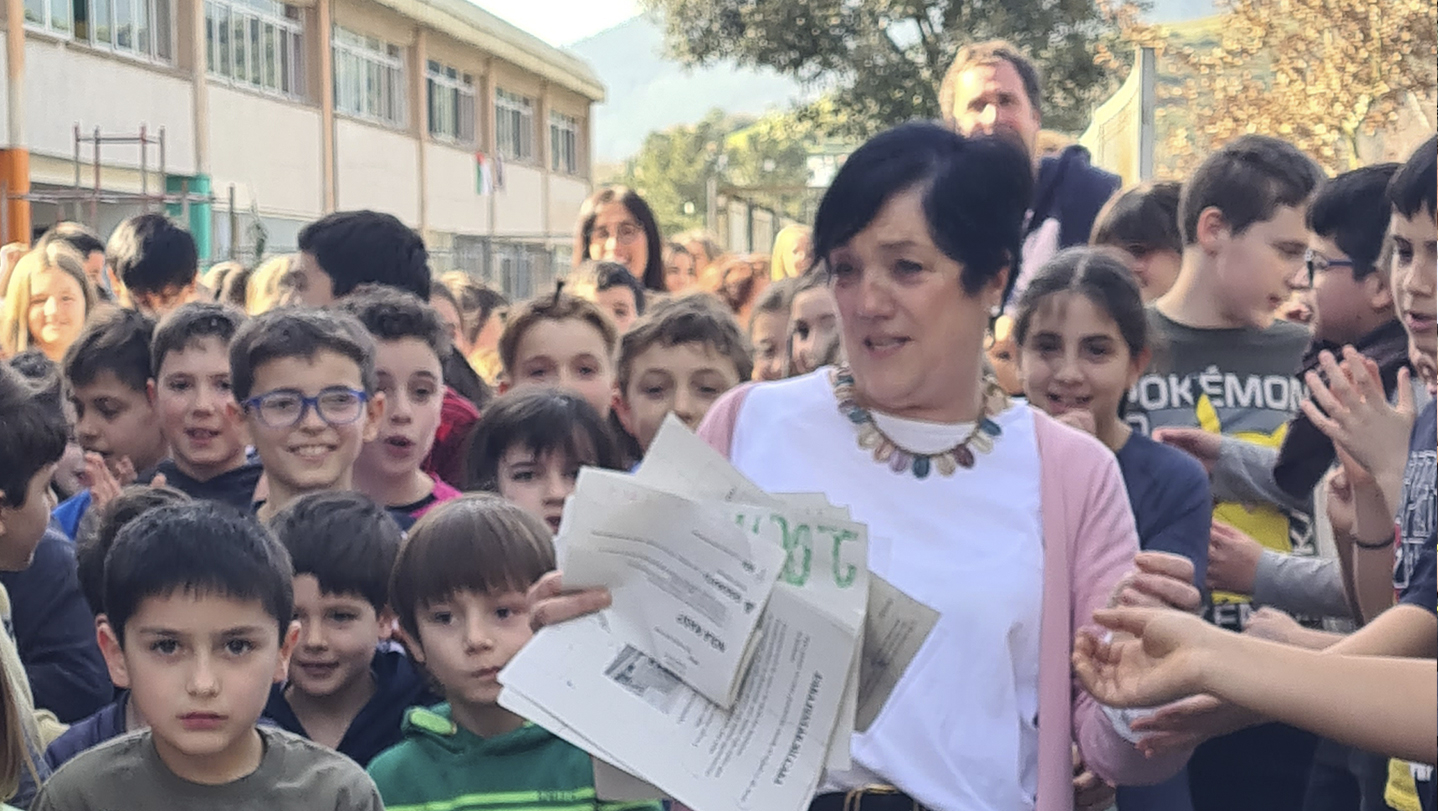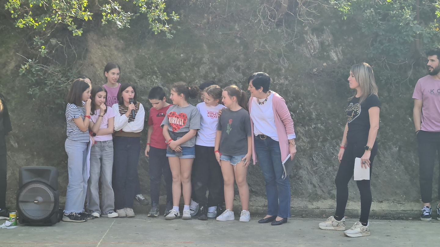 Kantu, bertso, malko eta barrez partekatu zuen bere agurra Lehen Hezkuntzako patiora hurbildutako ikasle eta lankideekin.