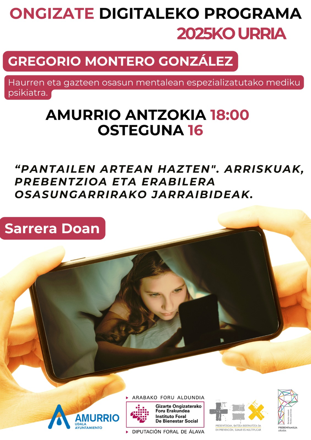 Urriaren 16an, osteguna, 18:00etan Amurrio Antzokian, Gregorio Moreno Gonzalezek, haurren eta gazteen osasun mentalean espezializatutako mediku psikiatra, eskainitako saioa izango da. Sarrera doan.