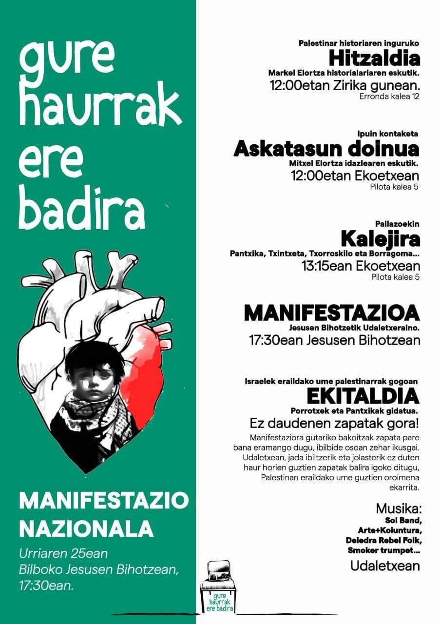 Euskal Herriko Ikastolen Elkarteak Gure Haurrak ere Badira ekimenak hezkuntza alorrean luzatutako deialdiarekin bat egin du. Urriaren 25ean, larunbata, Bilbon, egun osoko programa osatuko da Euskal Herriko Hezkuntza Komunitateak Israel Palestinan burutzen ari den genozidioa salatzeko eta haur palestinarrei omenaldia eskaintzeko. Ekitaldi nagusia 17:30ean Jesusen Bihotzetik abiatuko den manifestazioa izango da. Manifestari guztioi zapata pare bat eskuetan eramatea eskatzen digute.