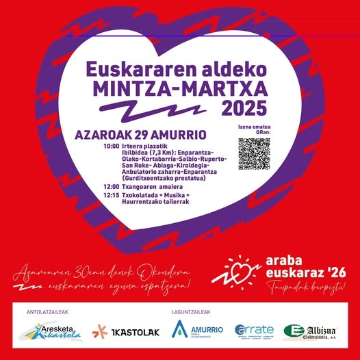 Azaroaren 29rako “Mintza martxa” antolatu dute Amurrion zehar Araba Euskaraz'26 kanpaina barruan. Aitzakia ezin hobea larunbat goizean ikastolakideok nahiz hurbildu nahi duen orok (helduak zein umeak) bat egiteko eta euskaraz edota euskarara hurbiltzeko unea sortzeko.