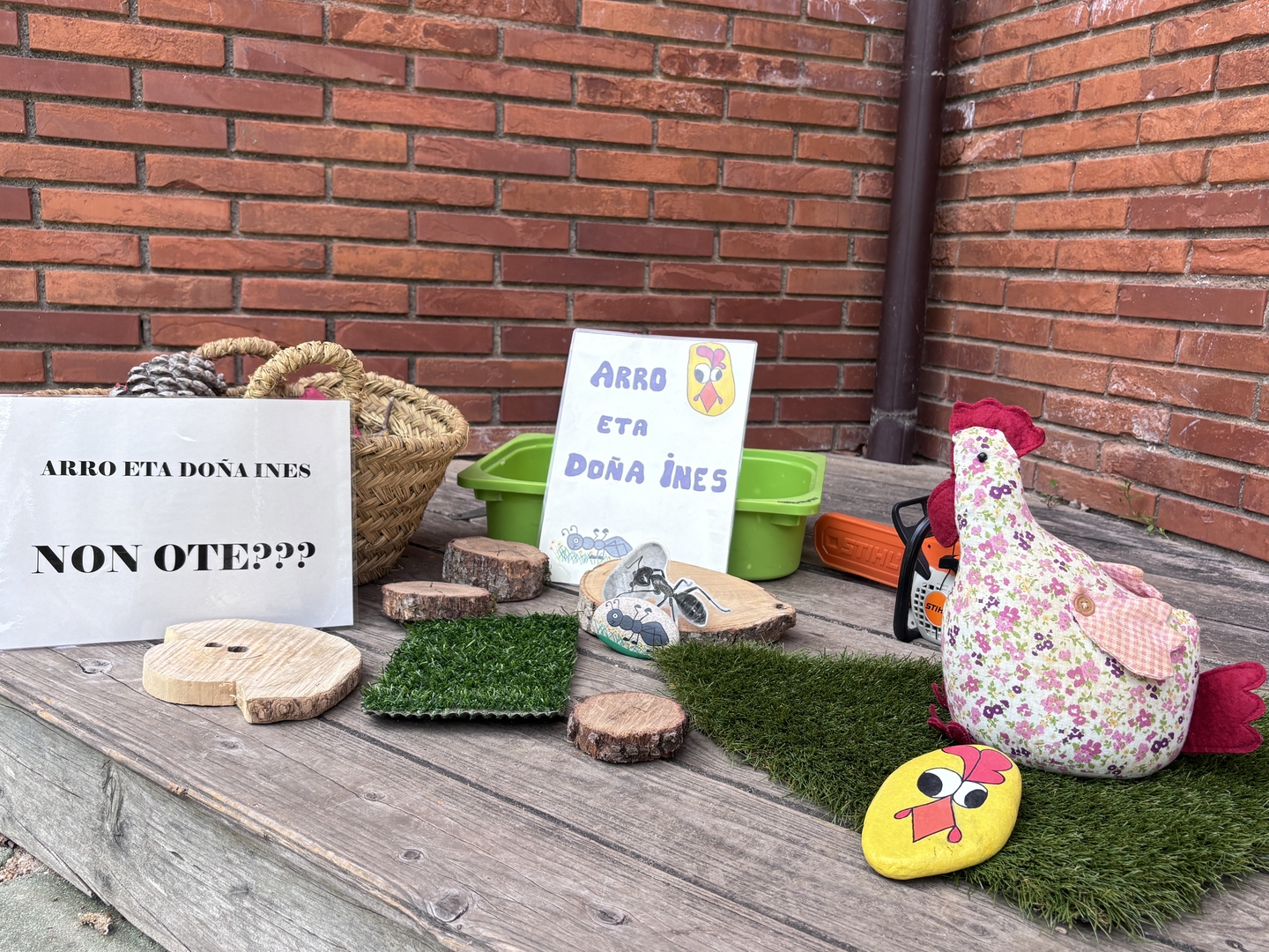 2 urteko gelatan Arro oilarra eta Doña Ines inurria ditugu bisitan. Ostenko baserria ezagutu ondoren (ikusi argazkiak erantsitako txostenetik), etxean abentura honi segida emateko ipuina eta kanta lantzeko proposamena doakizue.