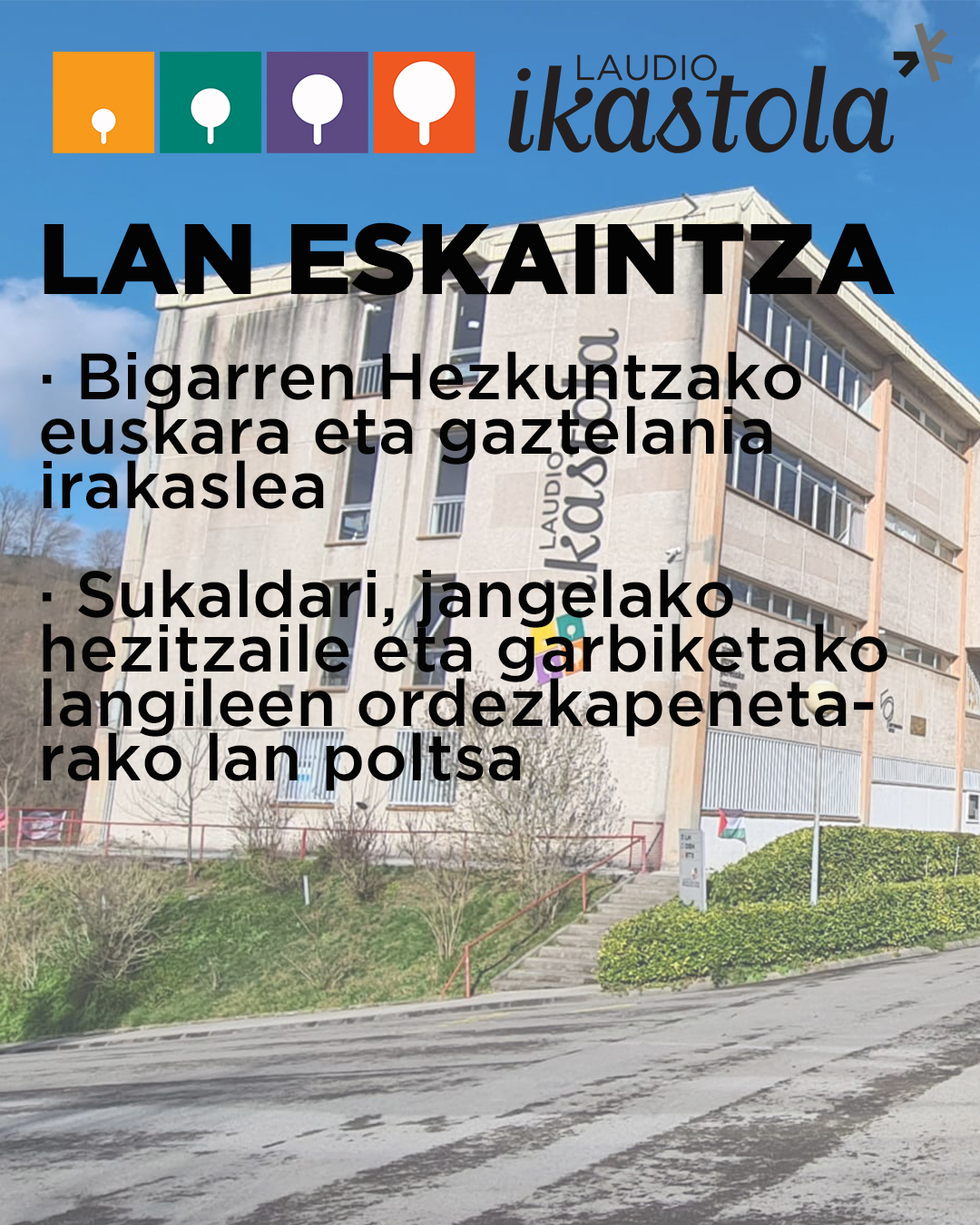 Sukaldari, jangelako hezitzaile eta garbiketako langileen ordekapenetarako lan poltsa agortuta, berritzeko epea zabaldu berri da. Irakurri hemen lanpostuetarako eskakizunak eta eskainitako lan baldintzak:
