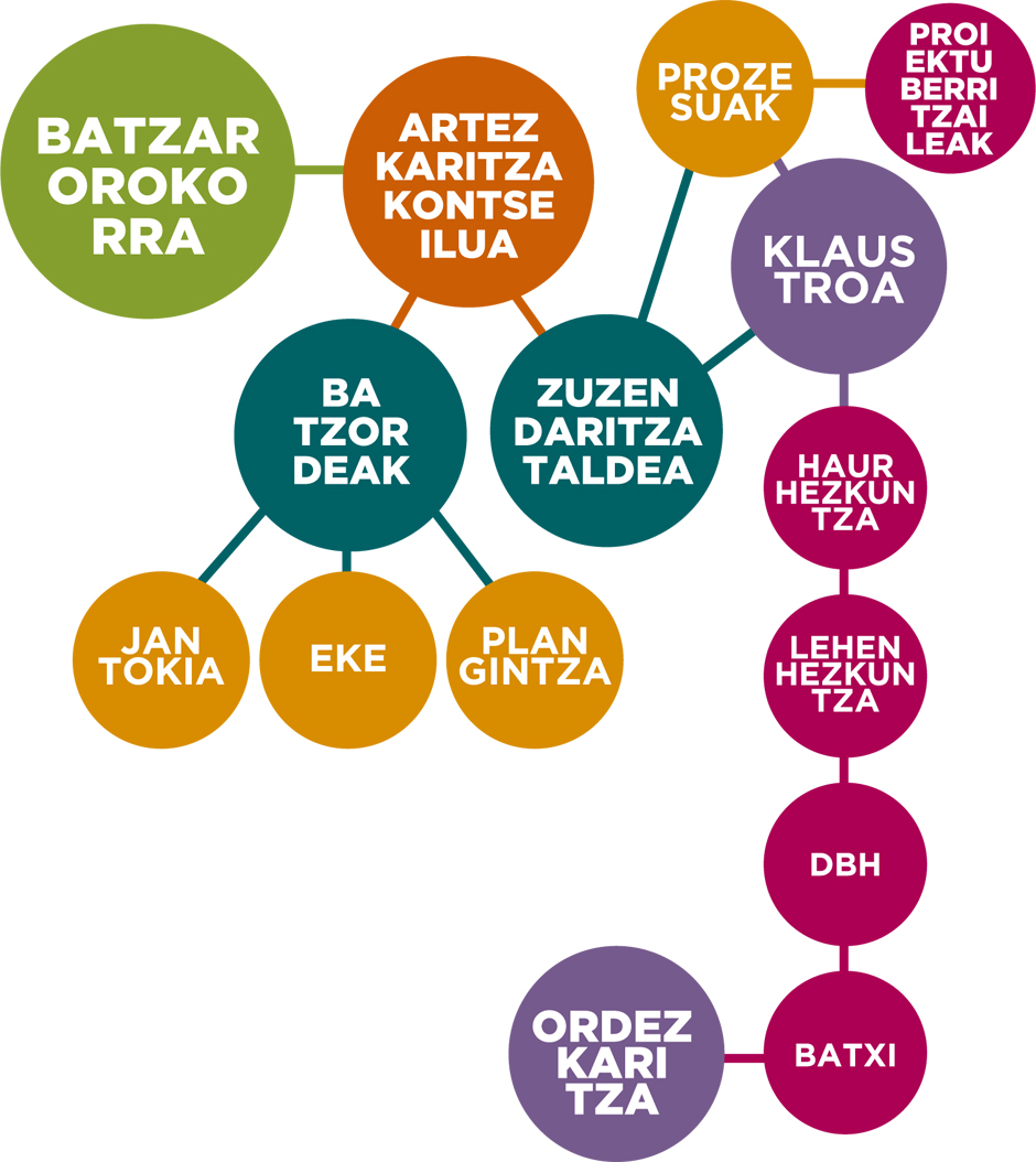 Programa, eremu edo jarduera zehatzetarako lan taldeak: planifikazioa, garraioa, jantokia, matrikulazioa, euskara, eskolaz kanpoko ekintzak…