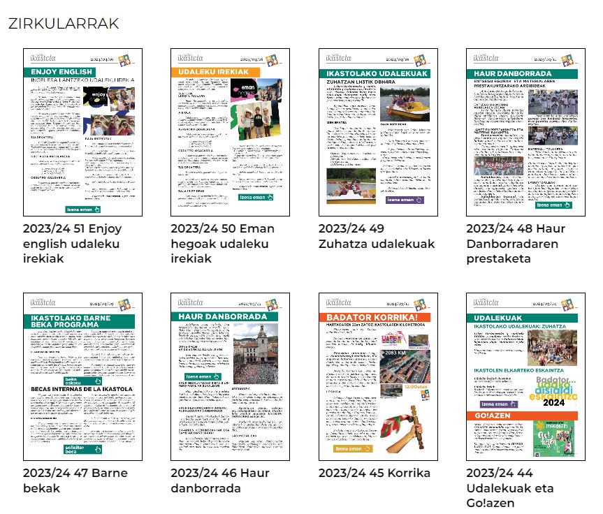 Asteartez argitaratzen dira paperez zein digitalean. Ikastolaren egunerokoan sortzen diren gaien berri ematen dute: Eskolaz Kanpoko Ekintzak, Jantokia, Garraioa, Bekak, Ekintza puntualak...